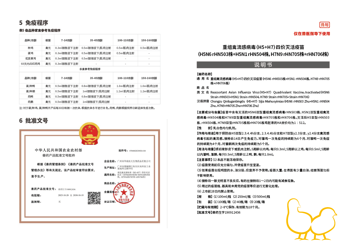 重組禽流感病毒(H5+H7)四價(jià)滅活疫苗(H5N6 rHN503株+H5N1 rHN504株,H7N9 rHN705株+rHN706株)