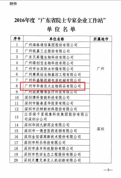 為貫徹落實《中共廣東省委 廣東省人民政府關于加強新時期科協工作的意見》(粵發(fā)[2013]2號)精神,充分發(fā)揮科協系統(tǒng)的組織網絡、人才智力和科學技術優(yōu)勢,進一步加快實施創(chuàng)新驅動發(fā)展戰(zhàn)略,將院士、專家等高端人才引入企業(yè),幫助企業(yè)解決技術難題,培養(yǎng)科技創(chuàng)新人才,促進產學研合作,提高企業(yè)核心競爭力,依據《廣東省“院士專家企業(yè)工作站”管理辦法(試行)》的規(guī)定,經有關單位申請、地方科協推薦、實地考察調研,省科協決定在廣州市華南農大生物藥品有限公司等44家單位建立“廣東省院士專家企業(yè)工作站”。建站期為2016年12月至2019年12月。