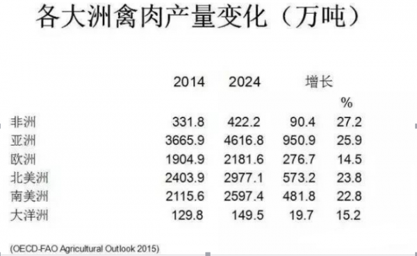 此外,據(jù)FAO(聯(lián)合國糧食及農(nóng)業(yè)組織)統(tǒng)計,全世界雞肉產(chǎn)量保持平穩(wěn)增長,雞肉生產(chǎn)總量近一億噸。但各大洲區(qū)域發(fā)展不太平衡。2014-2040年期間,雖然非洲地區(qū)雞肉生產(chǎn)基數(shù)低,但增長最快,增速為27%。因此在非洲,肉雞生產(chǎn)潛力巨大。