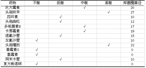 3.3 藥敏試驗 選擇14 種臨床常見抗菌藥物藥敏片, 在LB瓊脂平板上采用藥敏紙片擴散法操作,37 ℃培養24h 觀察結果。判定標準為:藥物抑菌圈直徑>20 mm 為高敏,15 ~ 20 mm 為中敏,10 ~15 mm 為低敏,<10 mm 為不敏感。
